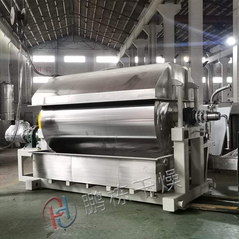 讓液體或泥漿狀物料在水蒸氣或其它熱載體加熱的滾筒表面形成薄膜,滾筒轉一圈的過程中便被干燥完畢,用刮刀把產品刮下來,露出的滾筒表面再次與原料接觸并形成薄膜進行干燥。