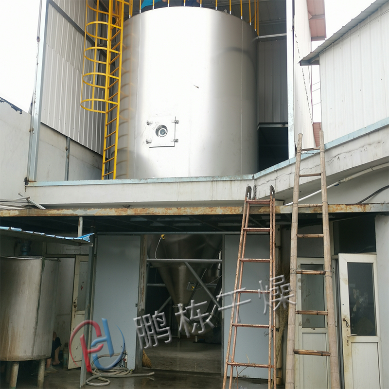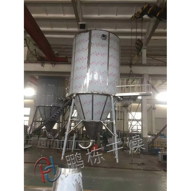 本機(jī)組工作過程為料液通過隔膜泵高壓輸入,噴出霧狀液滴,然后同熱空氣并流下降,大部分粉粒由塔底排料口收集,廢氣及其微小粉末經(jīng)旋風(fēng)分離器分離,廢氣由抽風(fēng)機(jī)排出,粉末由設(shè)在旋風(fēng)分離器下端的授粉筒收集,風(fēng)機(jī)出口還可裝備二級(jí)除塵裝置。